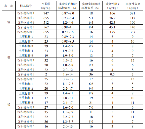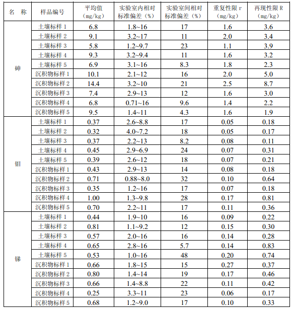 11.3 每批次樣品至少按10%的比例進(jìn)行平行雙樣測定,樣品數(shù)量少于10個時,應(yīng)至少測定一個平行雙樣。平行雙樣測定結(jié)果中,電熱板消解測定鈷(Co)、銅(Cu)、鉻(Cr)、錳(Mn)、鎳(Ni)、鉛(Pb)、鋅(Zn)、釩(V)、砷(As)的相對偏差應(yīng)小于30%,鎘(Cd)、鉬(Mo)、銻(Sb)的相對偏差應(yīng)小于40%;微波消解測定12種金屬元素的相對偏差應(yīng)小于30%。
