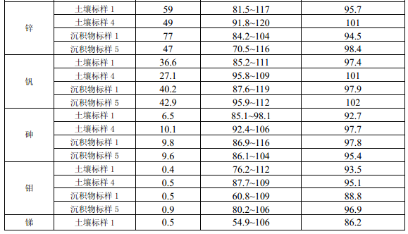 11.4 每批次樣品至少分析10%的加標(biāo)回收樣,樣品數(shù)量小于10個時,應(yīng)至少做一個加標(biāo)回收樣。加標(biāo)回收樣測定結(jié)果中,電熱板消解測定鎘(Cd)、鈷(Co)、銅(Cu)、鉻(Cr)、錳(Mn)、鎳(Ni)、鉛(Pb)、鋅(Zn)、釩(V)、砷(As)的加標(biāo)回收率應(yīng)控制在70%~125%之間,鉬(Mo)、銻(Sb)的加標(biāo)回收率應(yīng)控制在50% ~125%之間;微波消解測定12種金屬元素的加標(biāo)回收率應(yīng)控制在70%~125%之間。