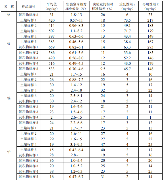 10.1 精密度6家實(shí)驗(yàn)室分別用電熱板消解法和微波消解法對5種不同含量水平的統(tǒng)一標(biāo)準(zhǔn)土壤樣品和沉積物樣品進(jìn)行測定,電熱板消解法的精密度匯總數(shù)據(jù)見附錄B中的表B.1,微波消解法的精密度匯總數(shù)據(jù)見附錄B中的表B.2。