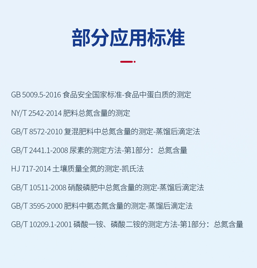 儀器采用凱氏定氮法的原理,用于食品、藥品、水產(chǎn)品、乳制品、化工、土壤、淤泥、谷物、植物、肥料、煙草、動物飼料等樣品中全氮和蛋白質(zhì)含量的分析以及其它揮發(fā)性組分的分析。