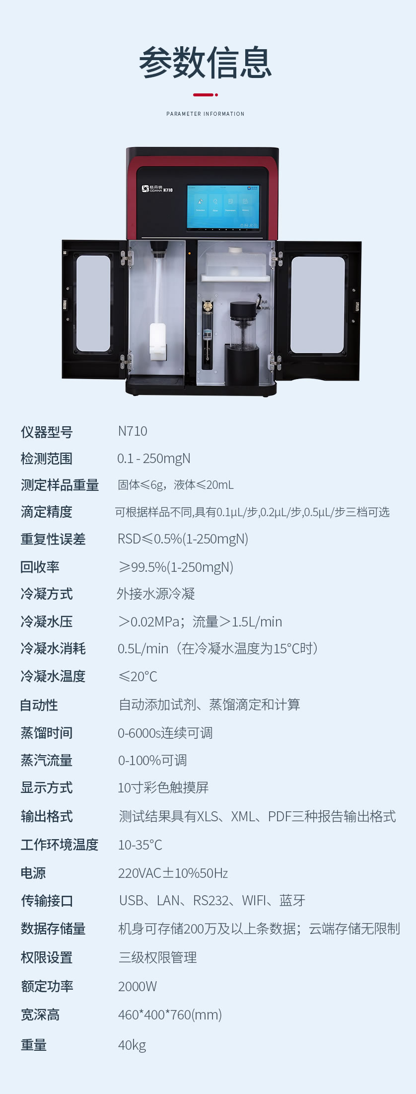 全自動加堿加酸加稀釋劑、全自動蒸餾滴定、全自動清洗、全自動消化管排空、全自動溶液液位監(jiān)測、全自動超溫監(jiān)測、全自動排廢、全自動計算結果、輸出、打印。