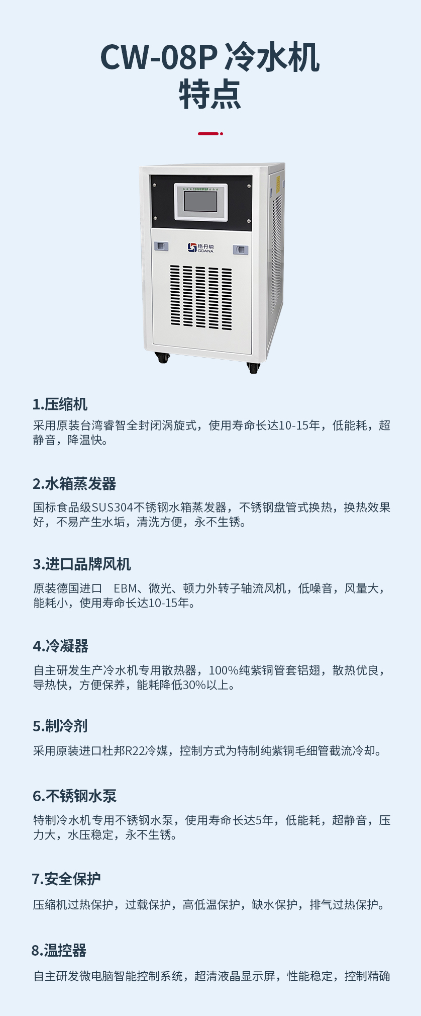 采用原裝臺灣睿智全封閉渦旋式,使用壽命長達10-15年,低能耗,超靜音,降溫快。