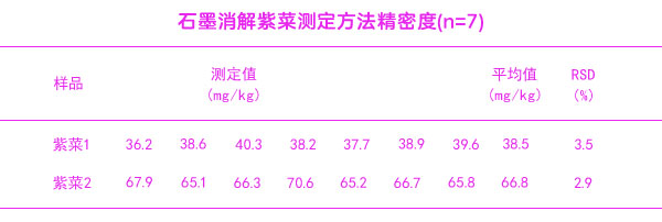 選擇隨機對不同濃度水平的食用紫菜樣品進行精密度試驗,進行6個樣品進行分析考察方法重現性,結果見表【石墨消解紫菜測定方法精密度】。