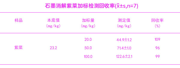 采用加標回收和標準物質考察方法的準確性。對紫菜樣品進行加標回收試驗,分別加入低、中、高濃度的砷標準溶液,樣品經前處理后測定,兩種藻類中砷的加標回收率范圍為96%一109%,見表【石墨消解紫菜加標檢測回收率結果】。