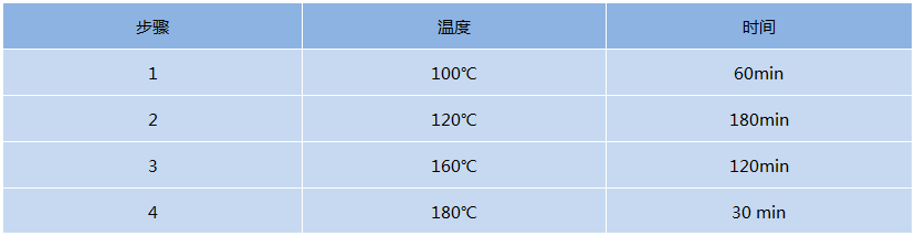 稱取0.2g(精確至0.1mg)樣品于聚四氟解管中,用少量水潤濕;加入5ml鹽酸。打開平板啟動設(shè)置好的程序開始加熱(消解程序下如表),100℃消解保持60min;加5ml硝酸、5ml氫氟酸、1ml高氯酸,加蓋,120℃消解保持180min;開蓋,160℃消解保持120min;最后溫度提高到180℃趕酸,當(dāng)加熱至冒濃厚高氯酸白煙時,加蓋,待消解管壁上的黑色有機物消失后,開蓋,驅(qū)趕白煙并蒸至內(nèi)容物呈不流動狀態(tài)的液珠狀。用1%硝酸溫?zé)崛芙饪扇苄詺堅?,轉(zhuǎn)移至25ml容量瓶中定容,搖勻,待測。同時做空白樣品。